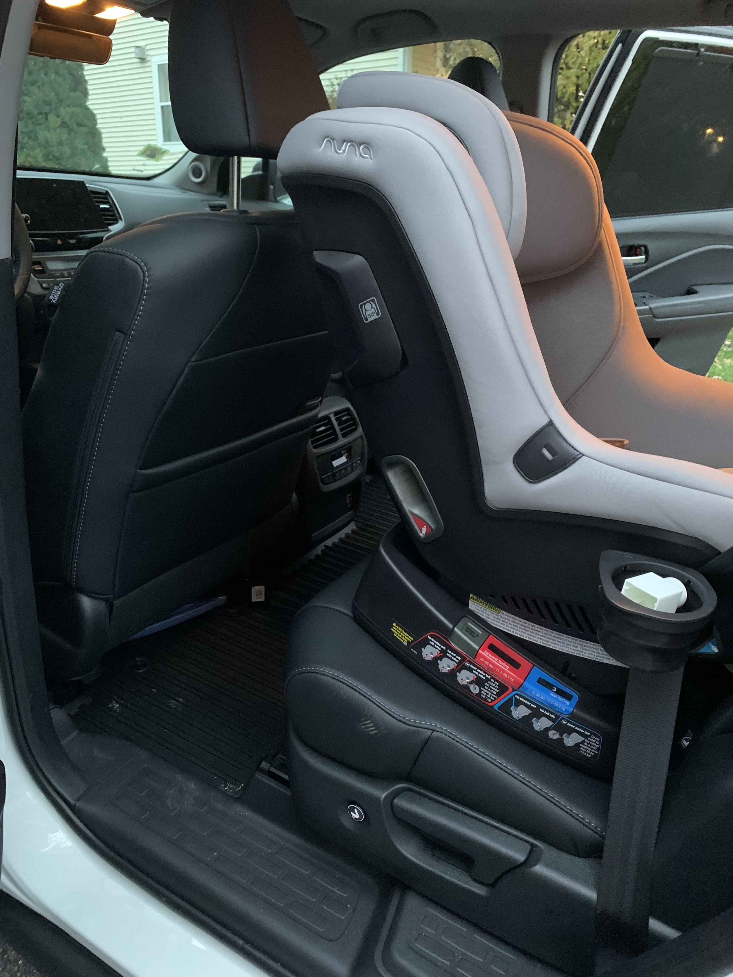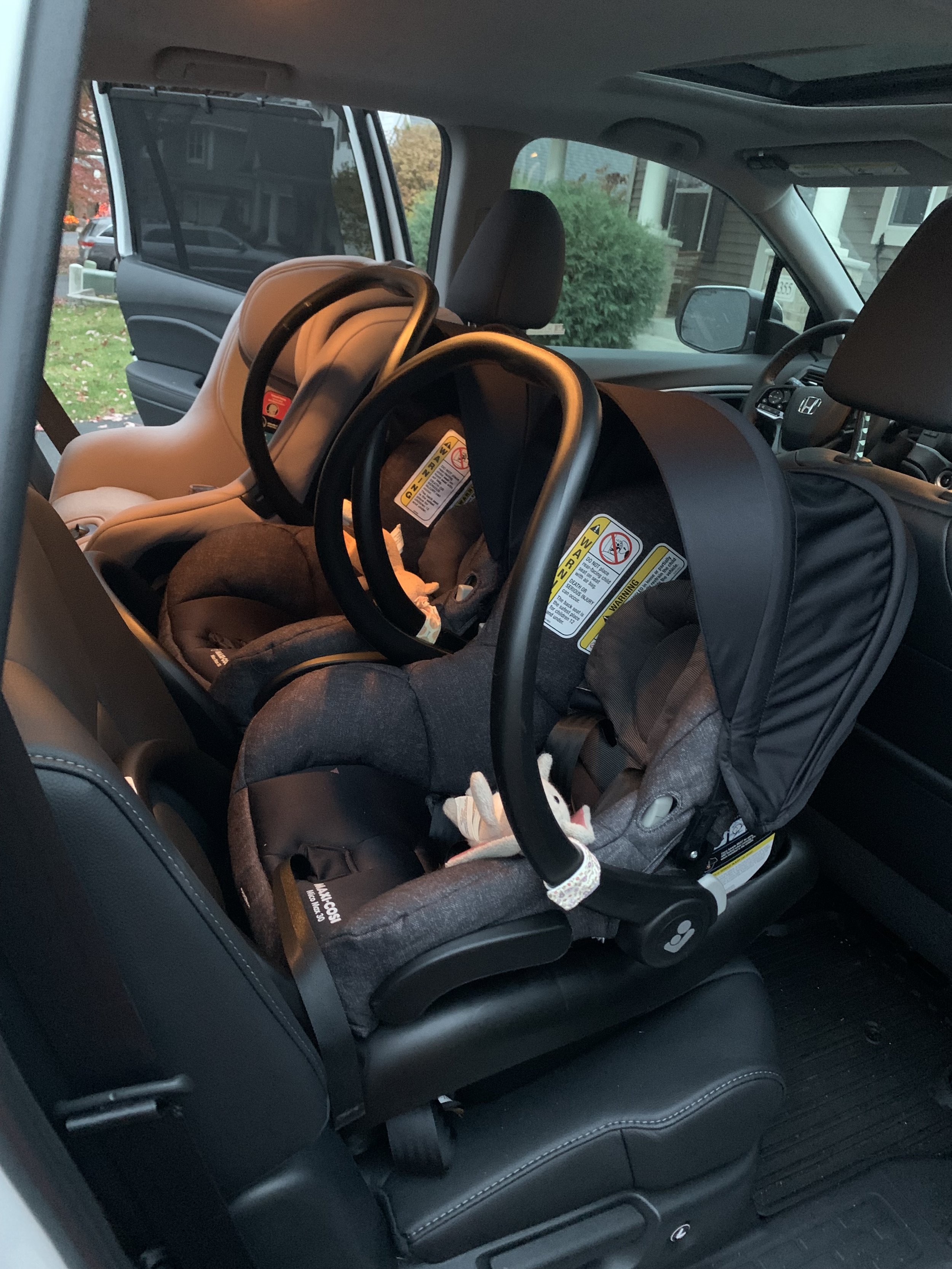 - Roomy for front passengers. Many cars we toured would fit the three car seats but the driver and/or front passenger would have their knees up to the dash. The Honda Pilot allowed for comfortable front seat positioning.