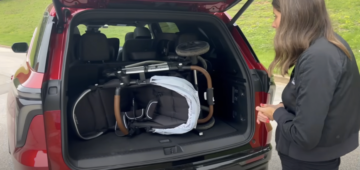I just LOVE the trunk space in the Traverse. To be specific, it has 23 cubic feet of space with the third row up and I could easily fit my Mockingbird stroller with room for a few groceries for sure. In a mid-size SUV, this is a major win. The Traverse also has a higher back with the third-row seats, which I feel secures things back here (like a stroller) much better.