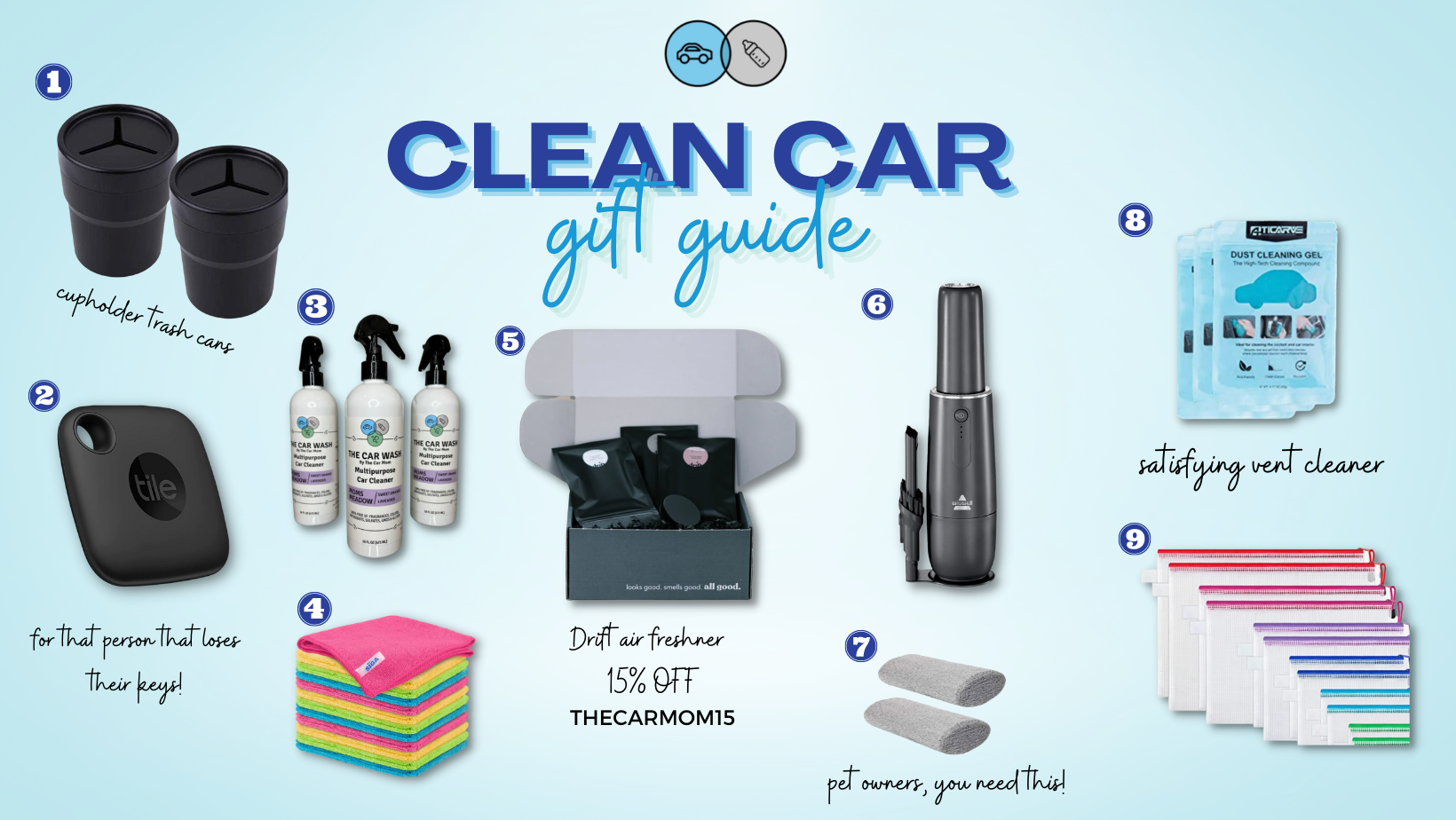 - CUPHOLDERS | 2. TILE | 3. CARWASH CLEANER | 4. MICROFIBER TOWELS | 5. DRIFT AIR FRESHENER | 6. CAR VACUUM | 7. PET HAIR REMOVER | 8. VENT CLEANER | 9. ZIP BAGS