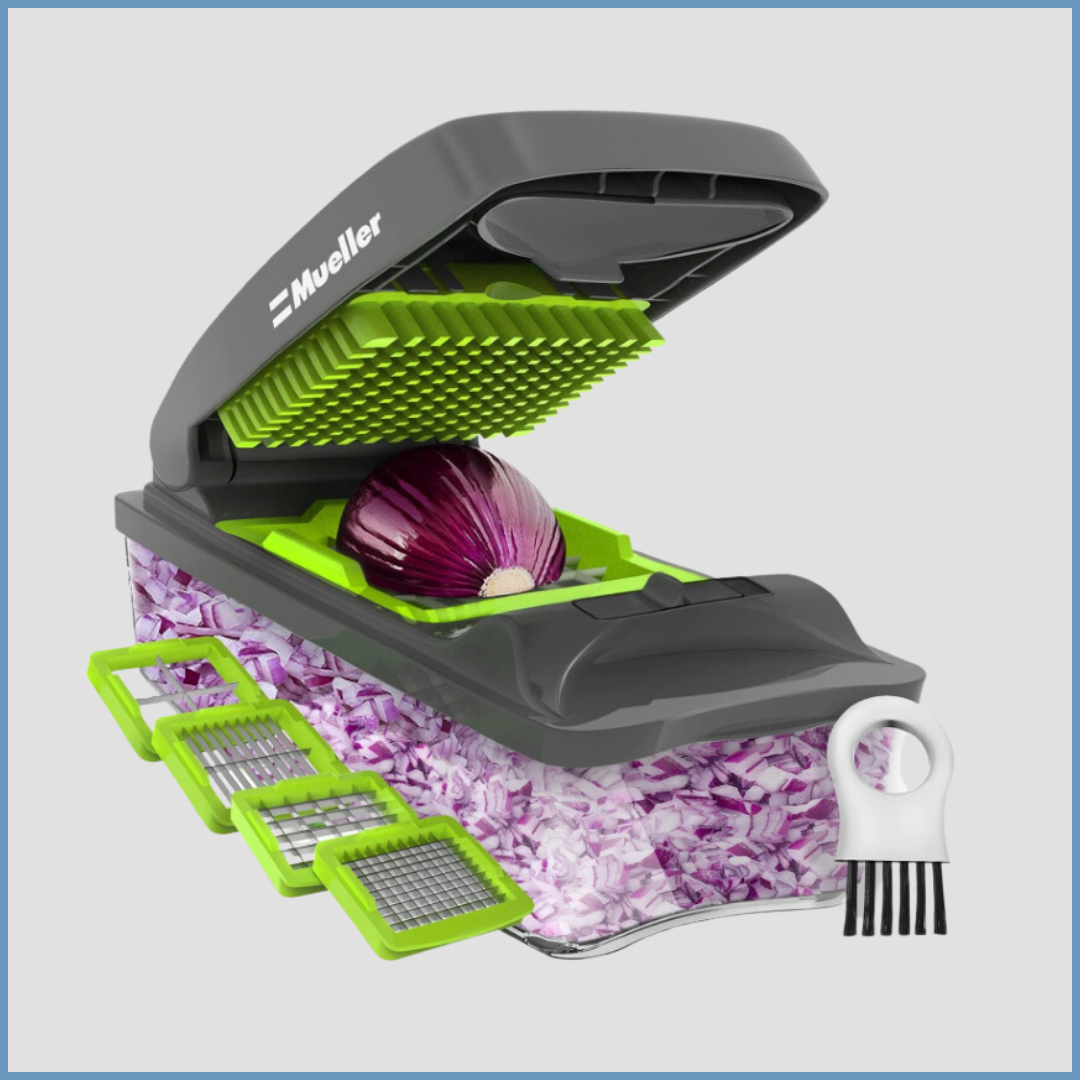 Chop and cut in one swift motion with this vegetable chopper. Fingers stay safe on the grip and away from the sharp stainless steel blades. It’s top rack dishwasher safe!