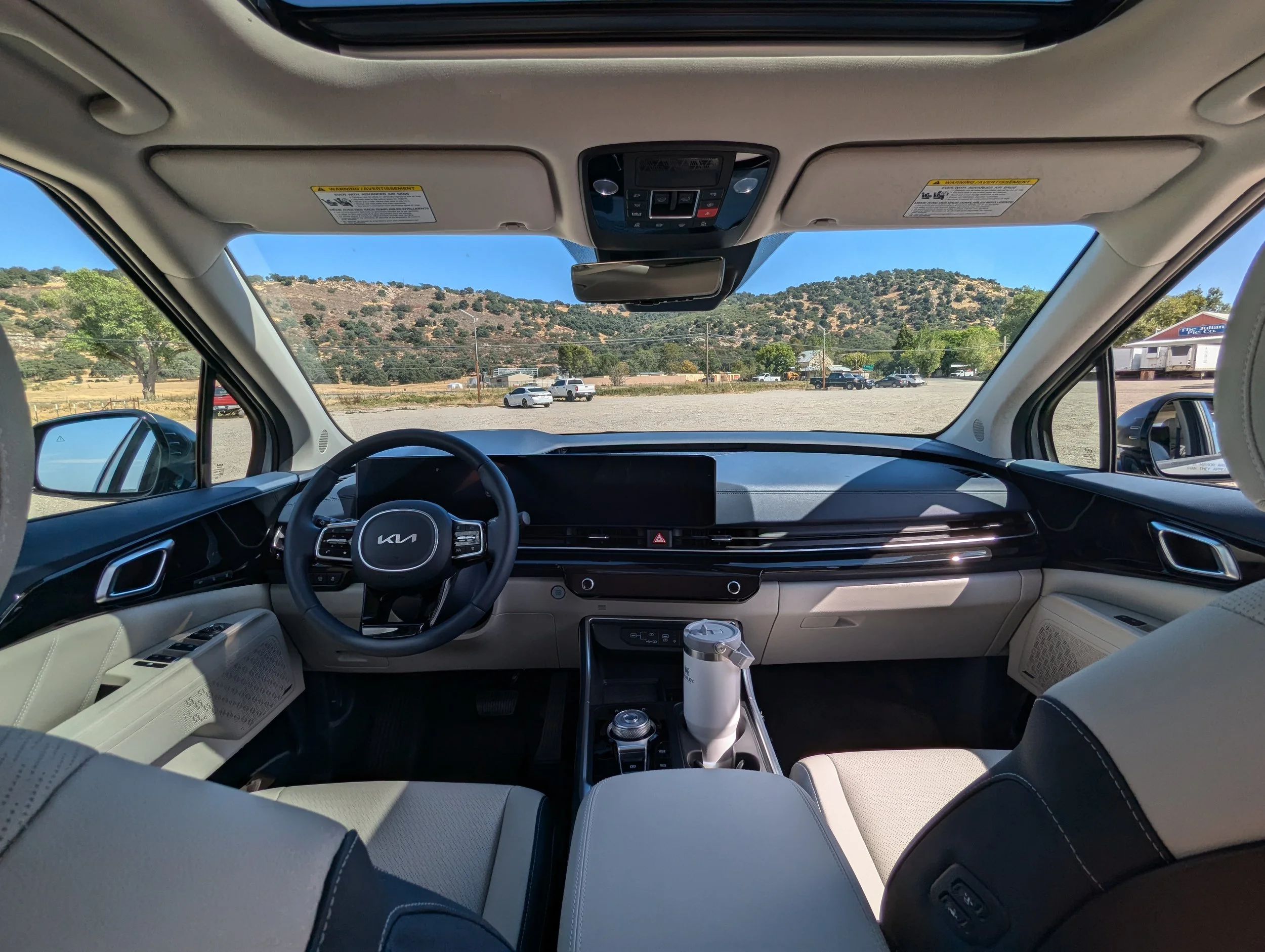 Inside, the EV9 maximizes space thanks to the absence of an engine, providing more room in the first and second rows compared to the Telluride. The cabin features firm yet comfortable seats, gunmetal gray trim (resistant to fingerprints), and a driver’s seat with calf support. High-tech amenities include a semi-curved infotainment display, Heads-Up Display, and a rearview camera mirror for unobstructed visibility.