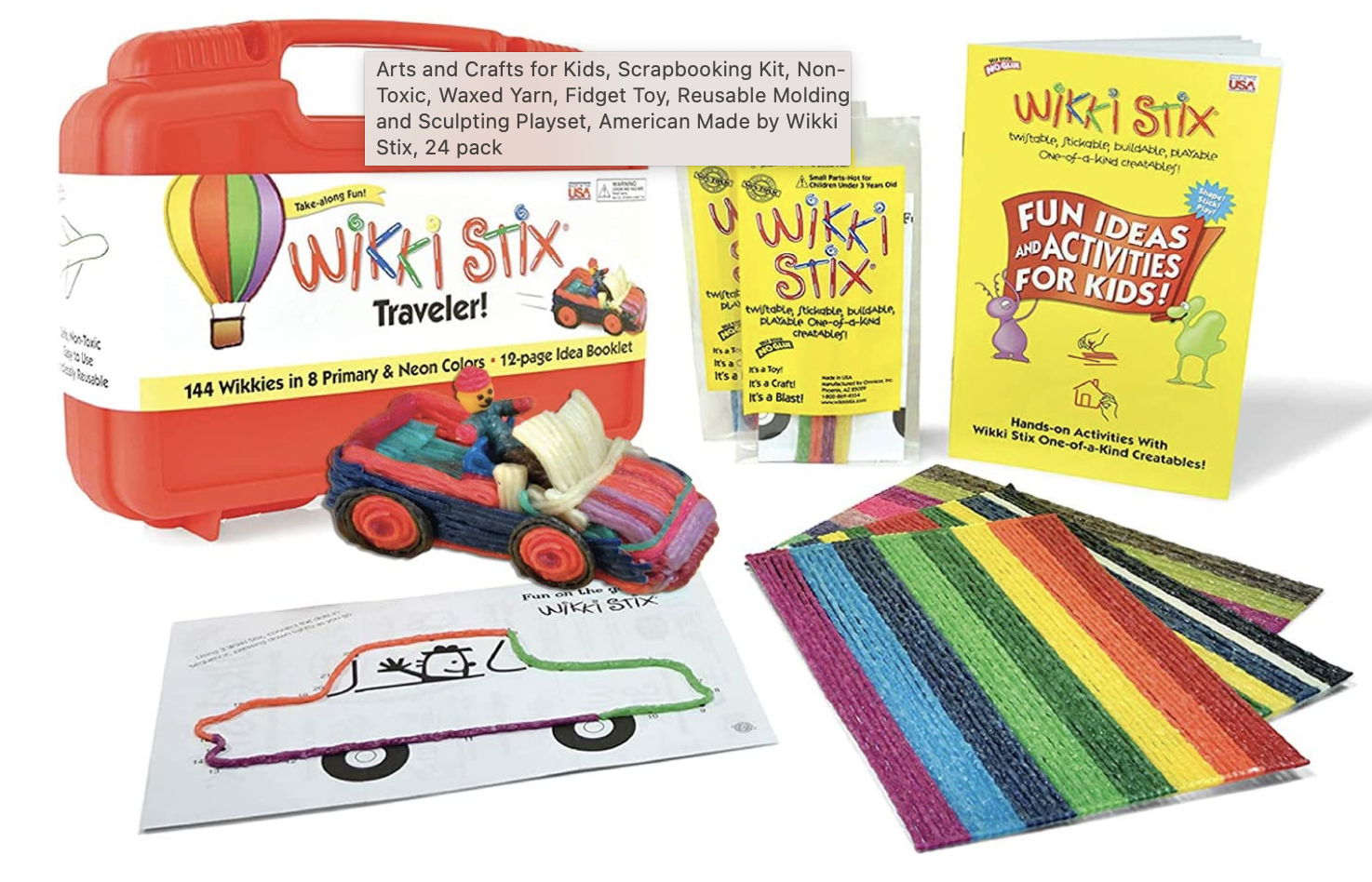 The Wikki Stix traveler is now one of my go-to road trip activities for my kids (and sometimes me!). Wikki Stix are wax sticks that you can mold to make different shapes with. The whole pack is travel friendly and it even comes with activities so you can do things like decorate Easter eggs. You take the wax sticks and outline the easter egg and then you can fill it in to decorate it. You can also make glasses, make a stick body, and there is so many other possibilities. Mold them to make anything you want and your kids get to use there imagination!